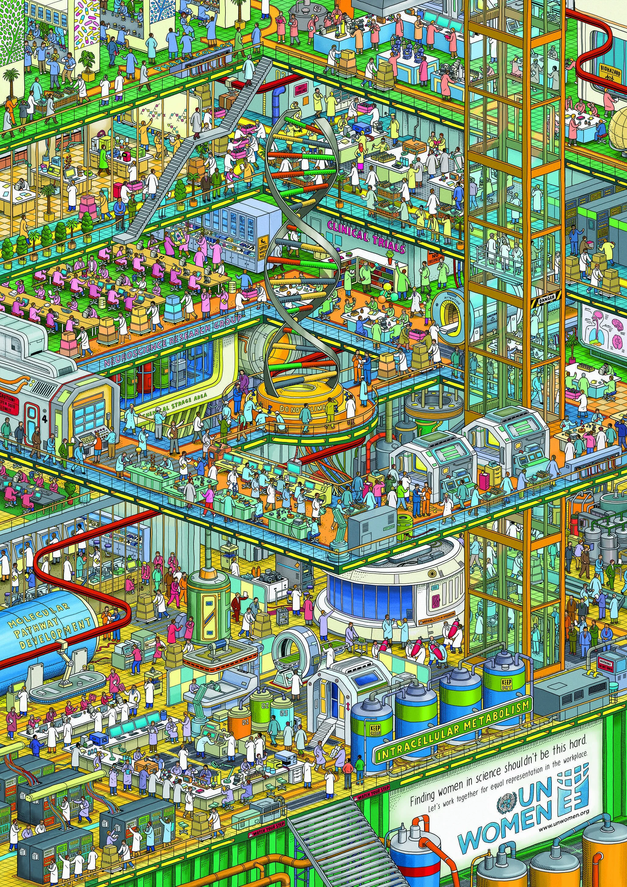 Egypt's Central Agency for Public Mobilization and Statistics states that in Egypt, women’s participation in the labour force has been low and stagnant around 23 percent. Women are especially under-represented in fields such as science, politics and technology. To highlight this issue, UN Women Egypt and DDB Dubai launched the "Finding Her" initiative. The series of illustrations show science, technology and political workplaces with only one woman.